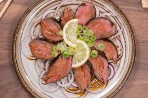 Tataki är en populär japansk förrätt, som går att göra både på fisk- och nötkött....