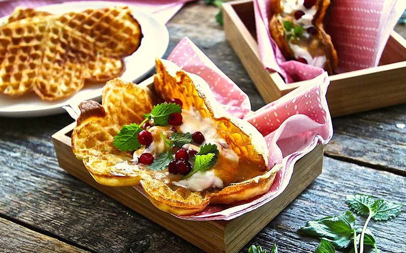 Vem älskar inte riktigt frasiga, nygräddade våfflor med grädde och sylt? Våga variera och testa dem även som lunch tillsammans med lite gräddfil, lax och gräslök. Källa: https://www.kungsornen.se/recept/vafflor/frasvafflor-med-smor/