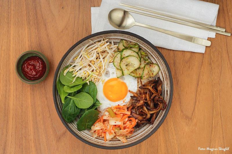 Bibimbap betyder ”rört ris” på koreanska och har många härliga smaker och konsistenser i samma skål. Viktigt är att röra ihop rätten så att ingredienserna tar smak av varandra. Här är ett favoritrecept av Mästerkocken Jennie Walldén som kommer från hennes kokbok ”Mycket smak på nolltid”. Källa: https://www.sundqvist.se