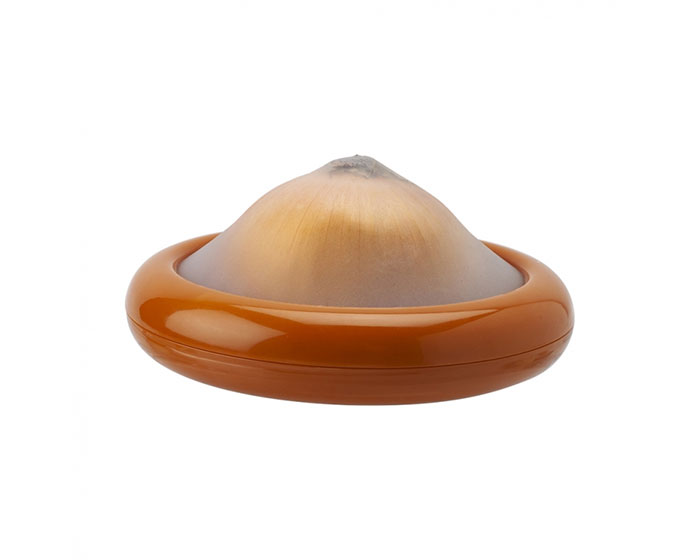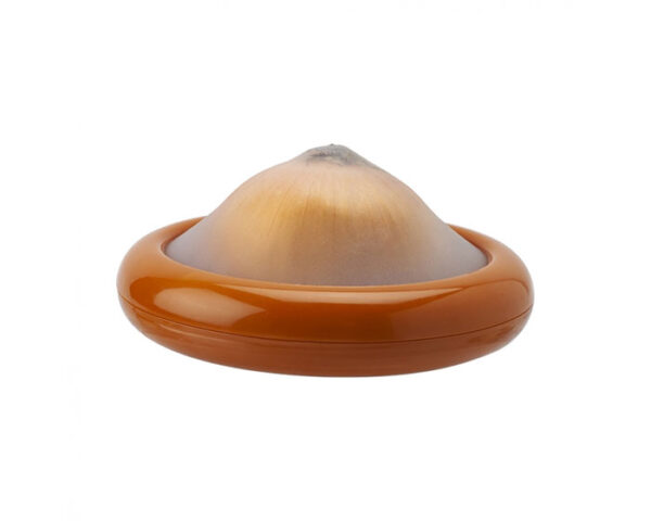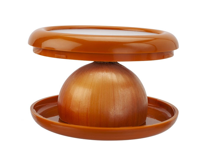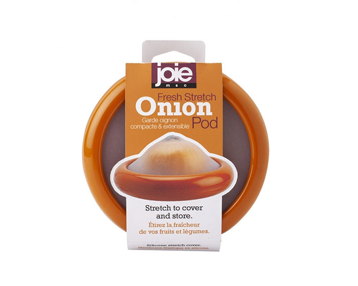 Praktisk förvaring för lök i en burk med lock i stretchmaterial som anpassar sig till lökens storlek och håller den fräsch.