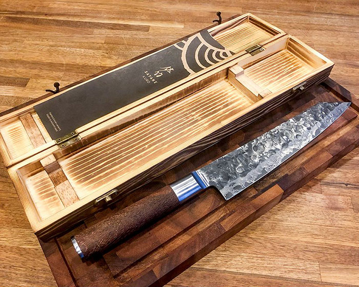 Kuro är en grovt hamrad kniv med ett blad av VG-10-stål som är processat åtta gånger vilket ger extra skärpa och en hårdhet på ca 58 HRC. Det långa handtaget av bränt trä med bolster och skaftände av 18/8-stål ger perfekt grepp, balans och stabilitet.