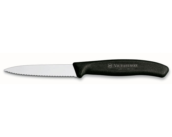 Vågig och spetsig grönsak-&skalkniv med ett svart handtag.